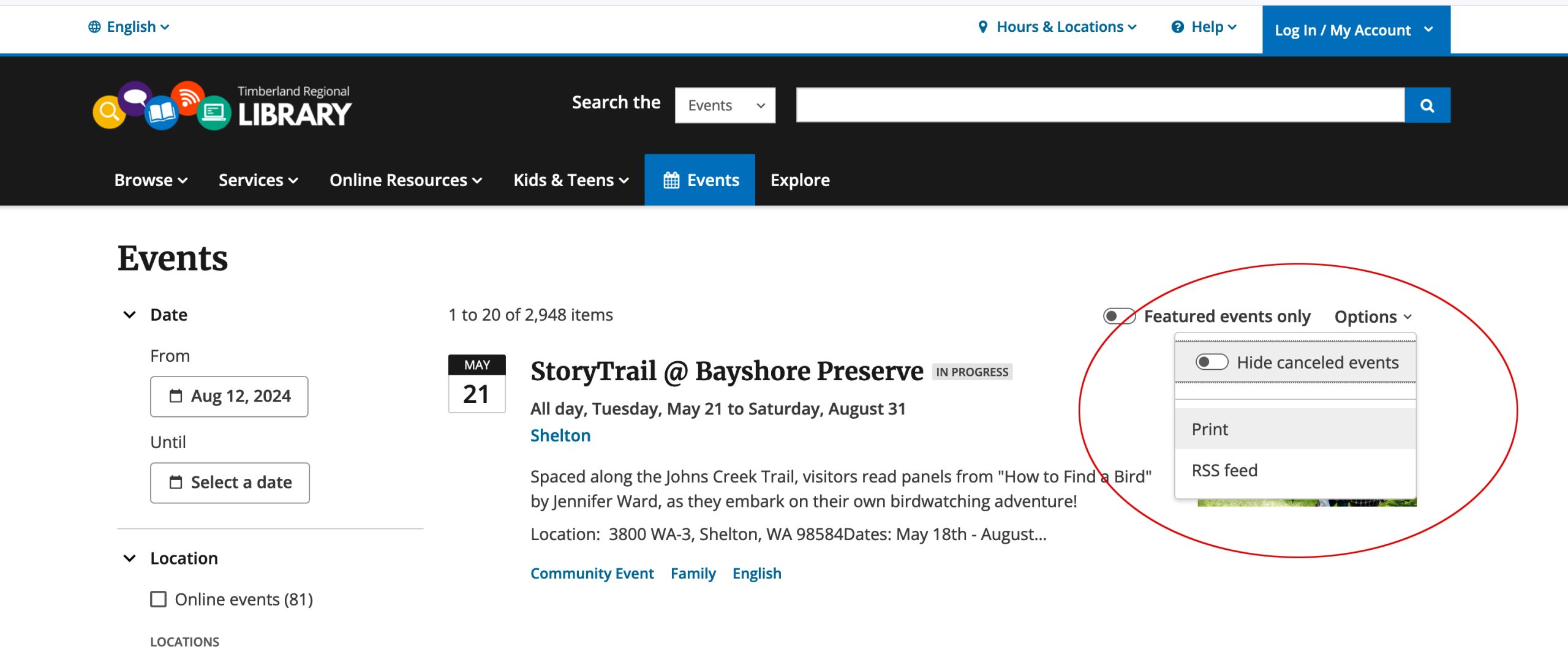 Yes! Visit our website and navigate to the events calendar. Select your "dates" 'Locations" and "categories" to personalize your search. Once you've made your selections click on the "Options" tab and select "Print".