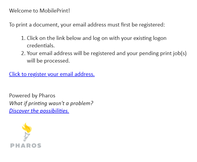 - Click on the Click to register your email address link. You will be redirected to the Pharos Print Center website.